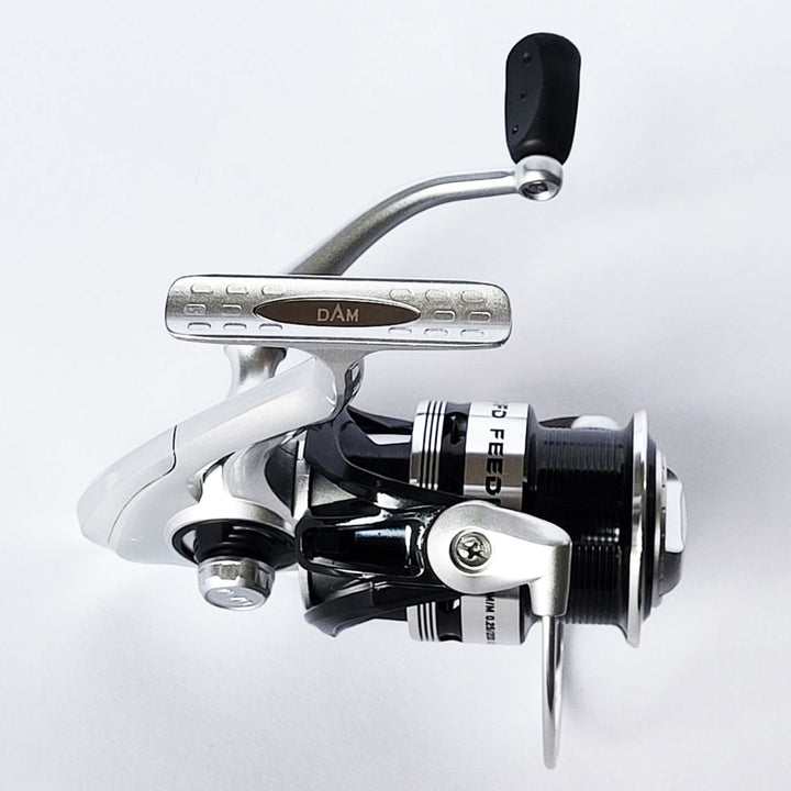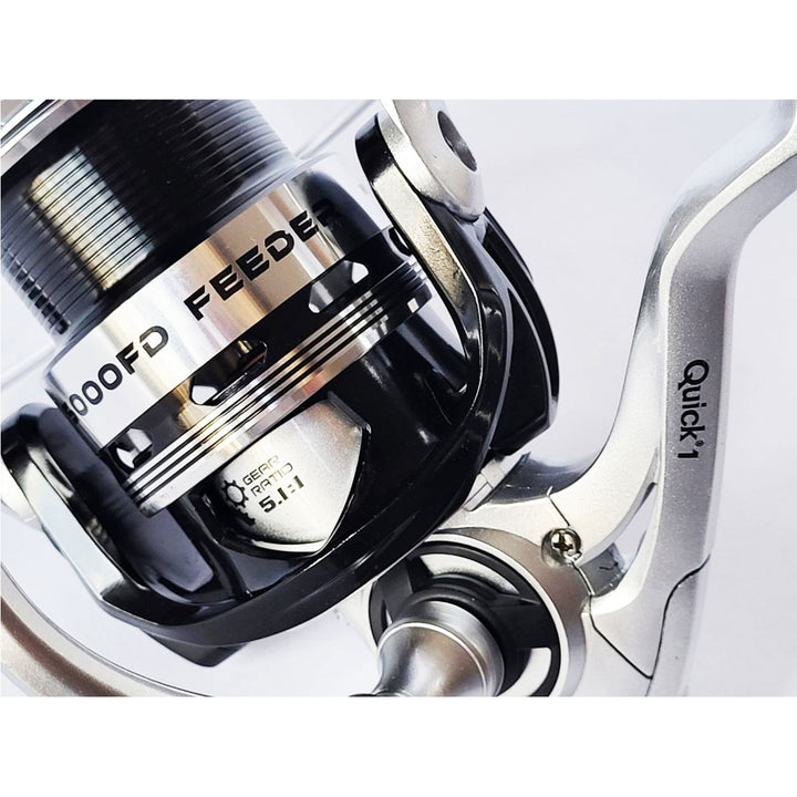 Mulineta DAM Quick 1 5000 FD Feeder a fost special conceputa pentru pescarii de feeder si are un raport calitate/pret imbatabil. Este o mulineta proiectata cu un corp masiv, constructie robusta si tambur pentru distante lungi. Acestea sunt elementele care definesc noul model Quick 1 5000 FD Feeder, realizat pentru pasionatii pescuitului cu momitor method sau clasic. Tamburul din aluminiu Shallow (cu buza subtire) este ideal pentru lansarile lungi si precise Prin tamburul masiv are capacitatea de derulare facila a firului, fiind o mulineta de precizie. Buza subtire sugereaza folosirea unor fire de diametre medii (0.20mm sau 0.25mm recomandarea producatorului), iar capacitatea tamburului declarata de producator este de 200 de metri de fir 0.25mm. Corpul din grafit contribuie la o greutate redusa a ansamblului. Mulineta beneficiaza de un sistem lent de oscilantie, menit sa aseze spirele paralel, lucru important pentru lanseuri precise.