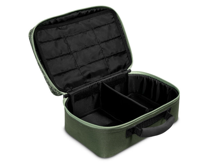 Geanta pentru accesorii Delphin Tackle SPACE este o geantă destinată pentru a depozita într-un singur loc toate accesoriile dumneavoastră. Compartimentul principal poate fi împărțit cu ajutorul unui despărțitor care se atașează cu benzi Velcro. Vă oferă foarte mult spațiu unde puteți depozita spre exemplu penarul de riguri, plumbi sau poate setul de avertizori. Geanta este prevazută deasemenea cu un perete desparțitor dotat buzunare mici pe ambele părți în care puteți depozita plicurile cu cârlige, agrafe, vârtejuri dar și alte accesorii utile pentru confecționarea monturilor. În mod sigur, în aceste buzunare puteți depozita inclusiv rolele mici de fire destinate confecționării forfacurilor. Pe fiecare parte a peretelui despărțitor există 9 buzunare mici.