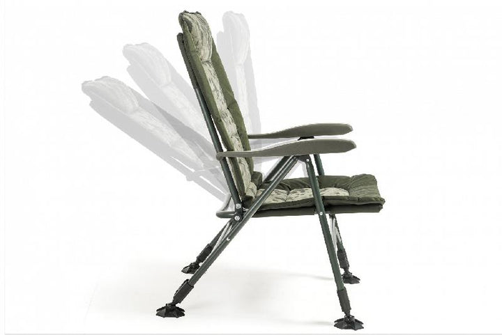 Scaun incadrat in categoria de lux, confortabil, cu spatar cu perna de neopren, forma anatomica și puternic captușit. Toate cele patru picioare sunt reglabile in functie de sol si sunt dotate cu talpa anti namol. Structura este stabila, surprinzator de ușoara și foarte puternica (capacitate 160 kg). Fotoliul ofera un sistem confortabil de inclinare a spatarului prin sistemul de brate, prin ridicarea acestora.