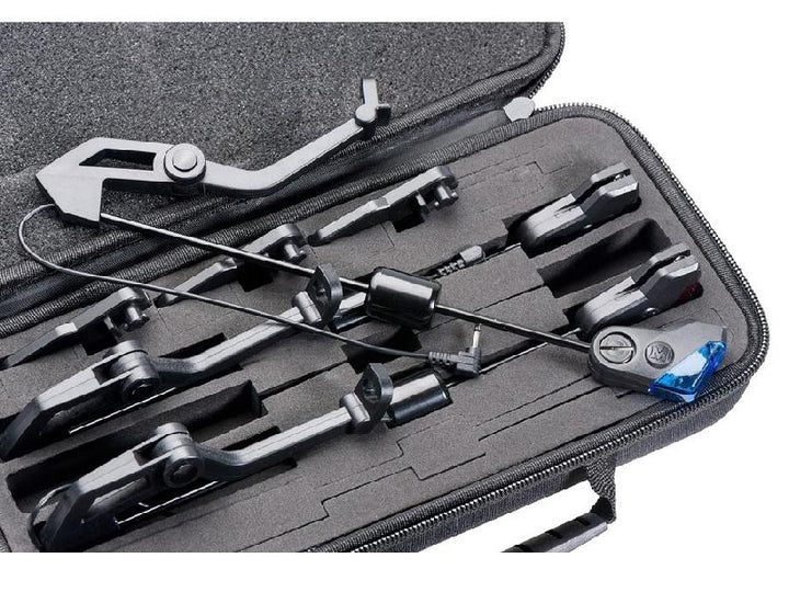 Setul standard include trei swingere stocate intr-un penar compact care le protejeaza in timpul transportului. Pescarii care pescuiesc cu patru lansete, pot cumpara separat swinger de culoarea galbena Swinger Mivardi Swing Arm MCX 66 , penarul avand loc dedicat pentru acest al patrulea swinger.