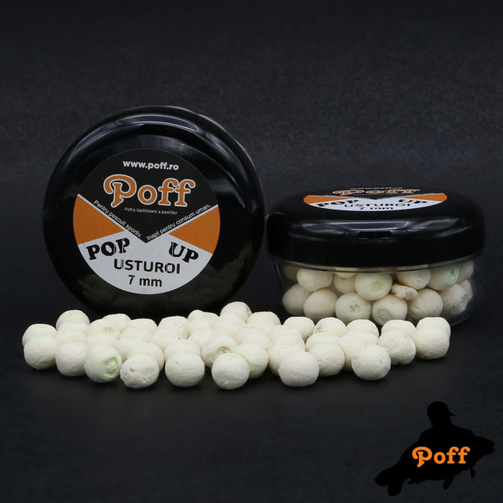 Pop Up, de mare atracţie, cu flotabilitate deosebită, aromă de usturoi. Acest pop up conţine cei mai buni aditivi, are o textură cauciucată, uşor de găurit cu croşeta, este flotant, se poate echilibra inclusiv cu cârlige mari sau monturi rigide articulate şi are o dispersie foarte bună a atractanţilor. Min. 40buc/cutie.