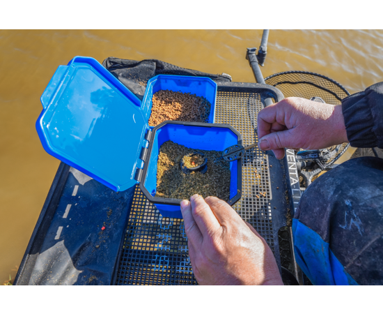 Cutia pentru nadă si pelete este prevăzută cu un capac rabatabil, care permite deschiderea și închiderea ușoară. Ideală pentru depozitarea tuturor tipurilor de momeală, protejându-le de intemperii. Fabricată din plastic rezistent și fără colțuri, cutia este ușor de curățat.