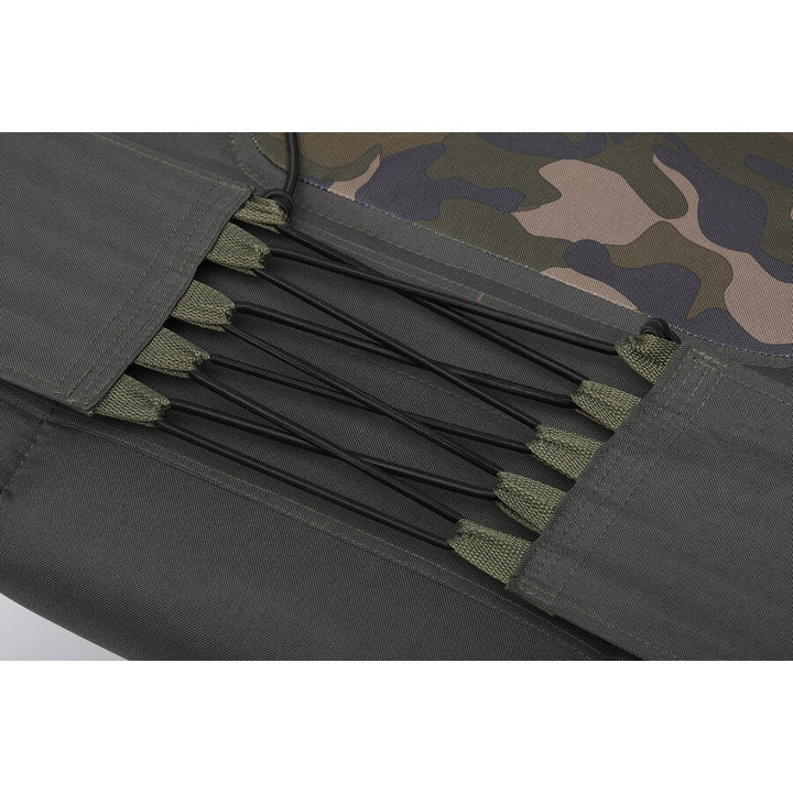 Salteaua cu formă anatomică este acoperită cu o țesătură rezistentă la apă 600D în culoare verde subtilă, cu inserții în camuflaj Avenger elegant.