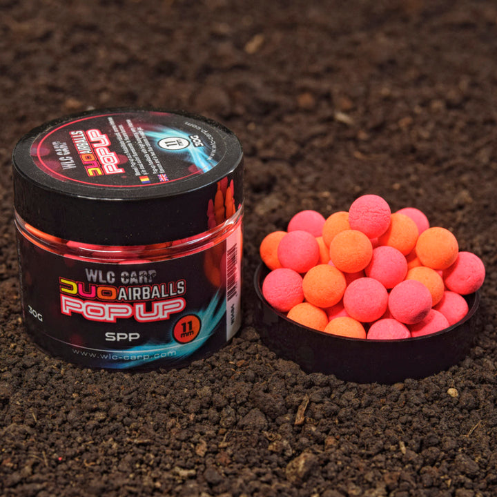 Momelile Pop-up Duo Airballs SPP 11mm au la baza un mix imbunatatit, extrem de flotant realizat 100% de catre echipa WLC Carp iar cele doua culori Portocaliu Fluo si Roz Fluo din borcan ofera doua optiuni cu o vizibilitate crescuta in orice tip de apa.